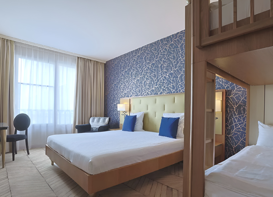 The air - conditioned standard rooms come with either a king size bed with two bunk beds*, or two queen size beds.